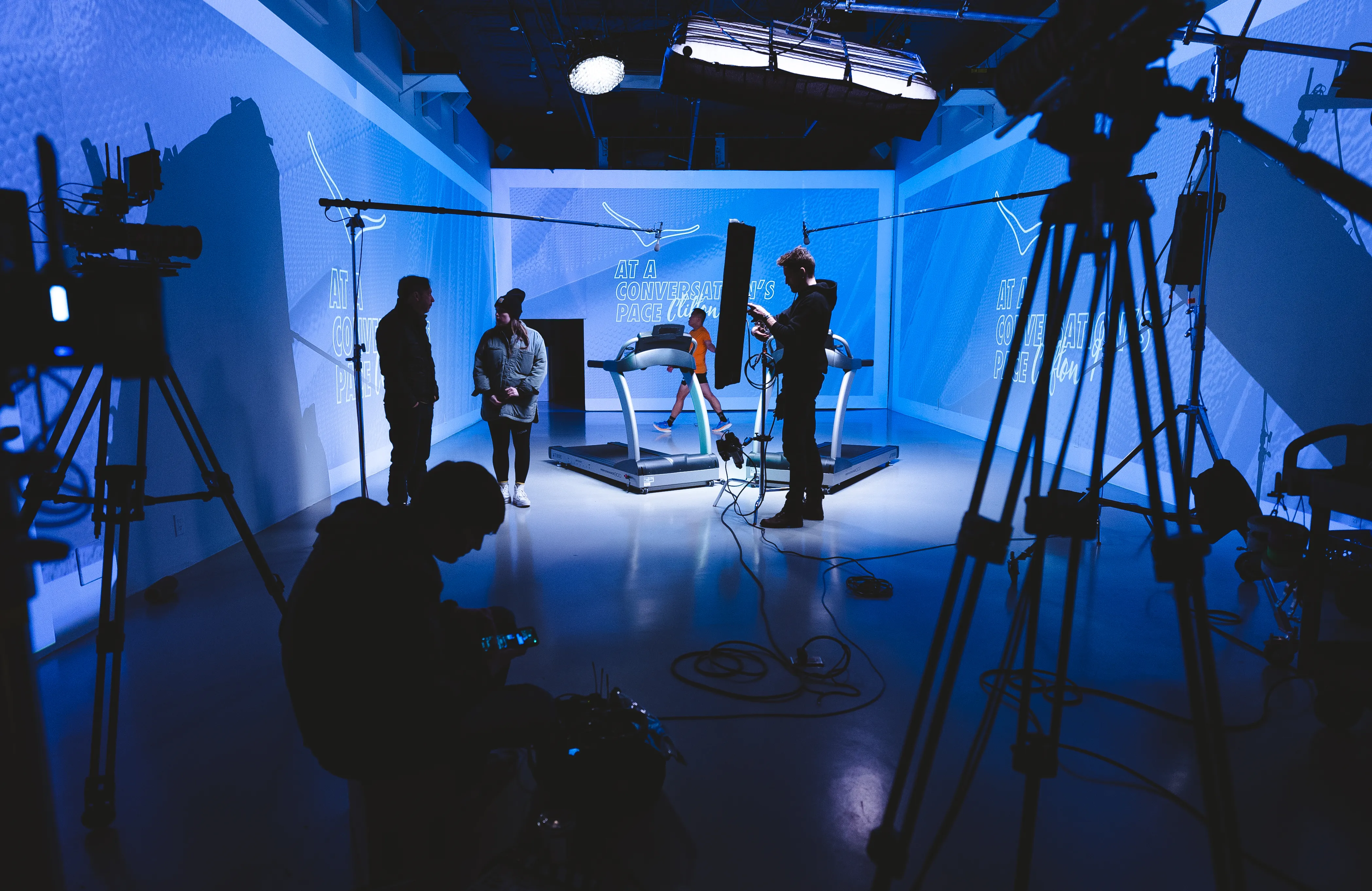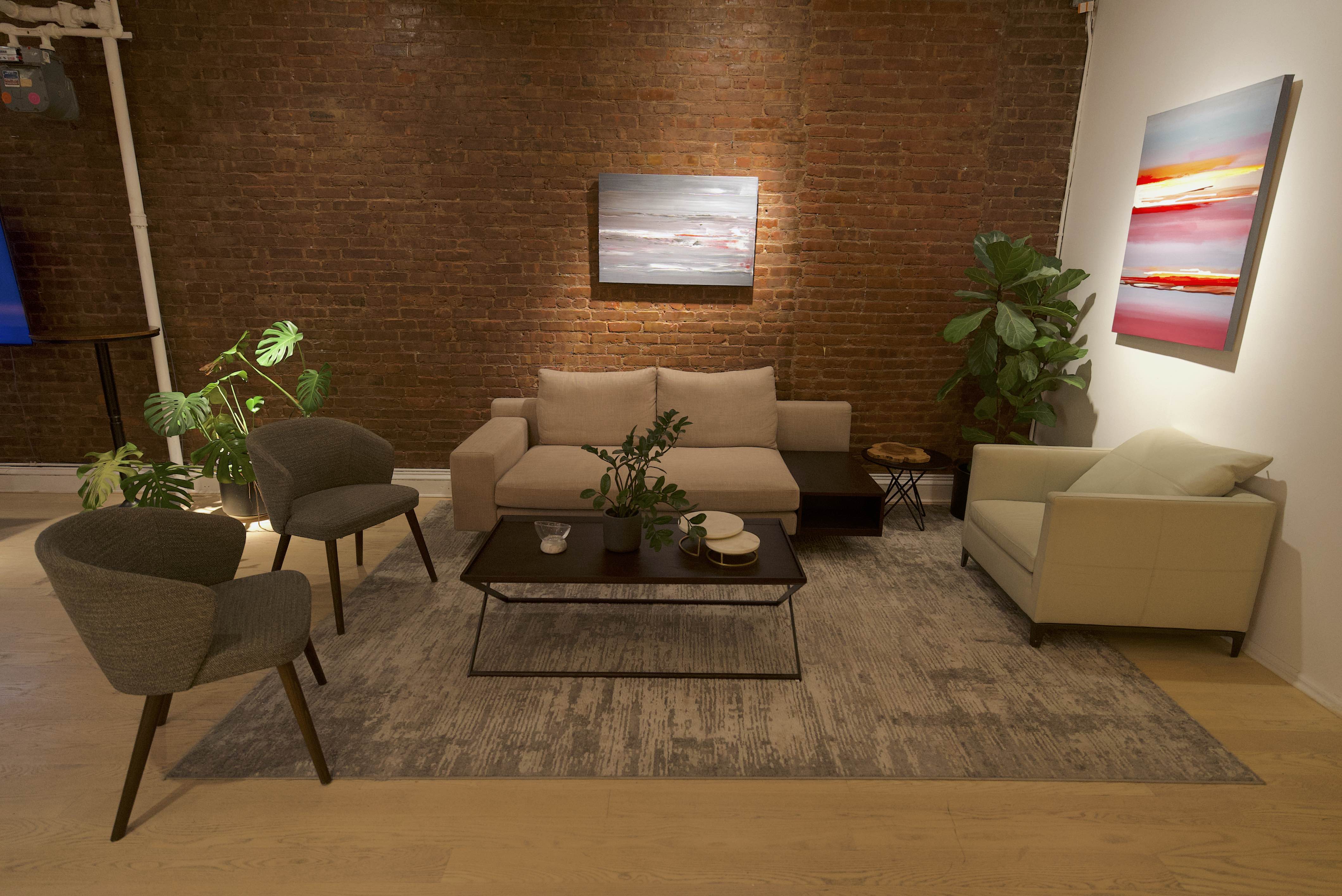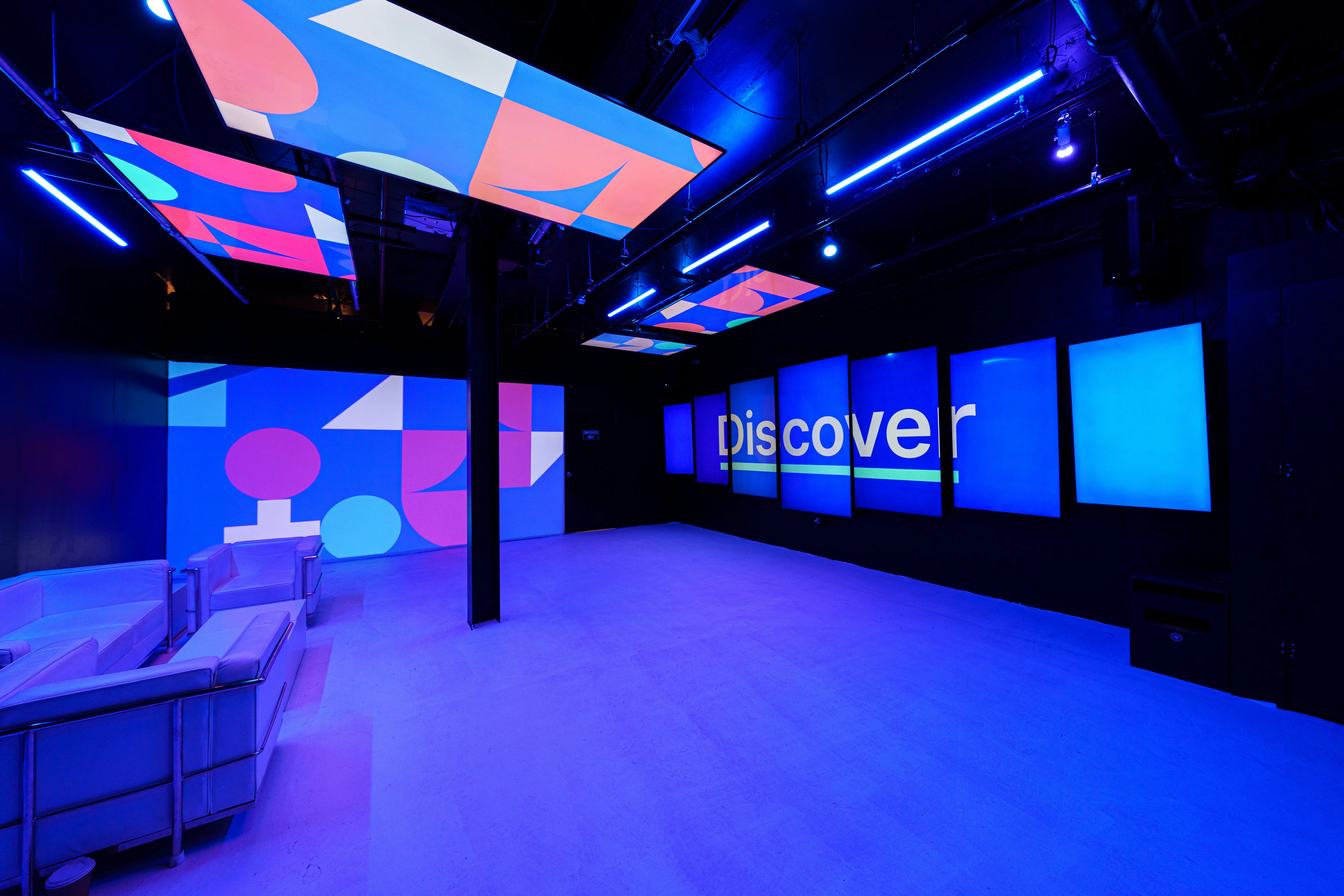 A low lit companion space featuring customizable screens throughout the space. Use it as a lounge, a production zone, or a sleek back of house hub that keeps the main floor pristine.